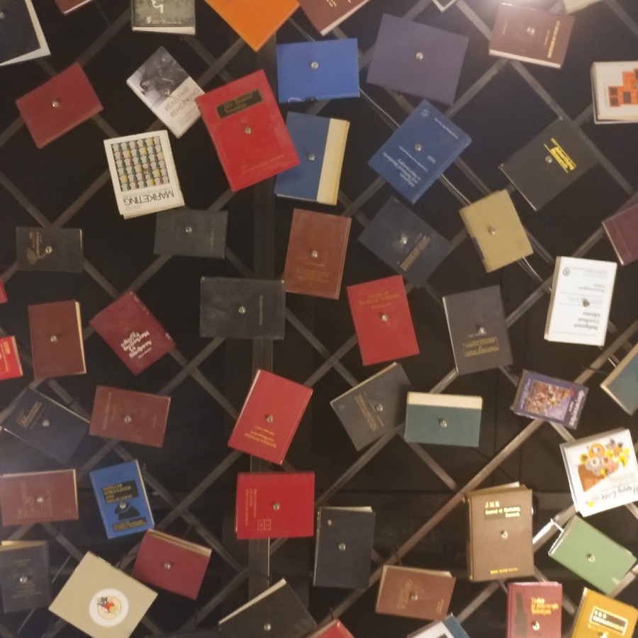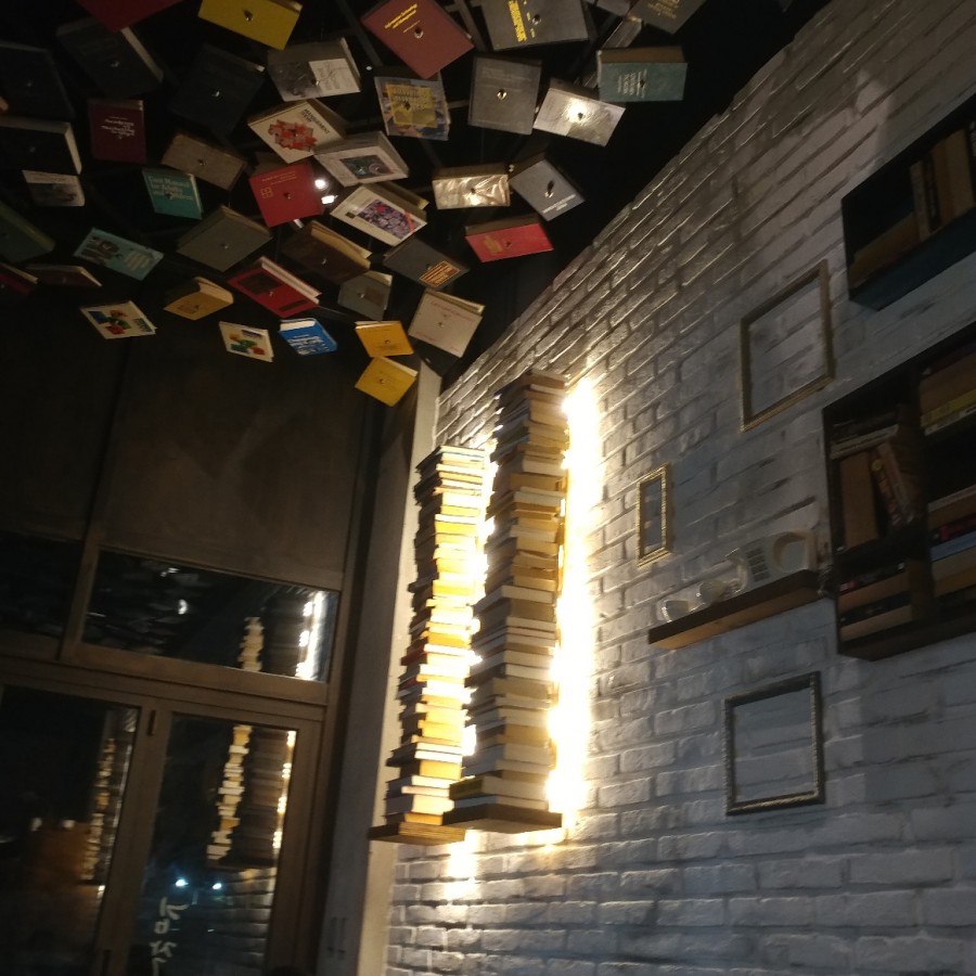 내부가 특이하다 천장에 책들을 매달아 놨다