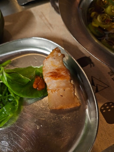 된장 고기 바질을 함께 싸먹으니 맛있었돠~